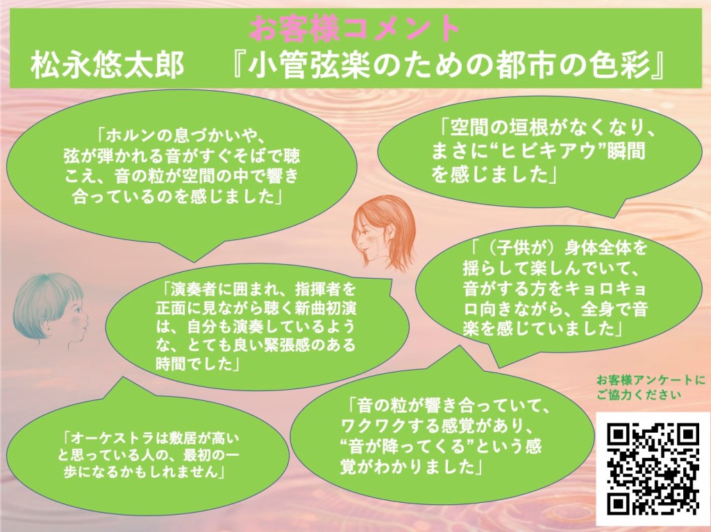 松永悠太郎氏による委嘱新作では、音楽家が客席に散らばり、お客様の中に入って演奏します。また、お客様には風船を配り、音の振動を視覚や触覚でも実感できるようにします。そのような仕掛けを通して、一方通行の「演奏」ではなく、会場全体が楽器となる「ヒビキアウ体験」をつくり出します。また、ご希望の方には実際に楽器に触れられる体験企画も予定しています。