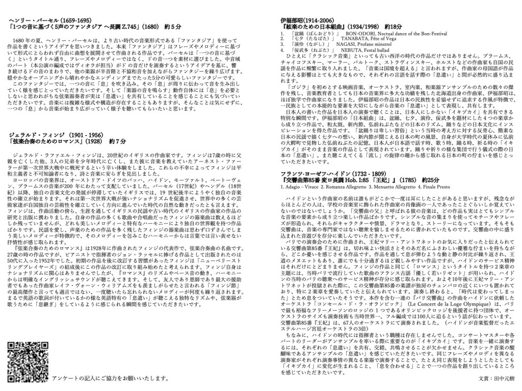 イキヅカイは、音楽作品や演奏における「息遣い」をテーマに、西洋の古典音楽から日本の風物詩を題材にした作品までを、小編成オーケストラによる演奏でお届けするコンサートです。
