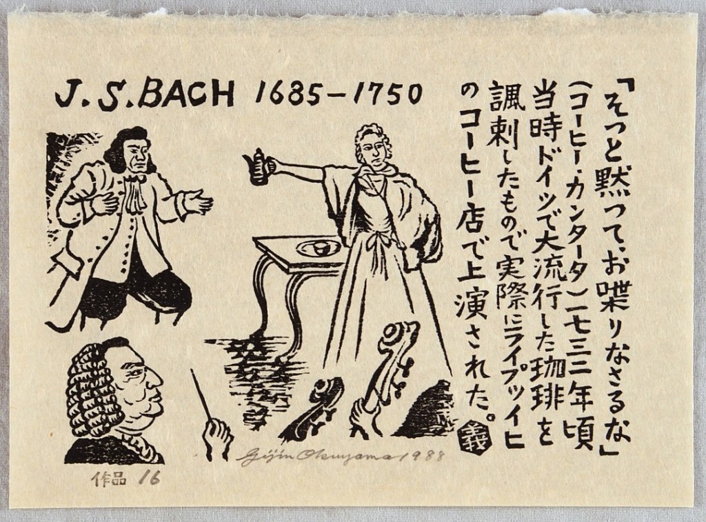 ベートーヴェンが無類のコーヒー 好きで毎朝60粒のコーヒー豆を数えて自ら挽いていたことも有名ですが、「音楽の父」バッハはコーヒー好きが高じて「コーヒーカンタータ」なる作品まで作ってしまったほどでした。1934年に浅草で生まれた版画家の奥山義人さんが1993年に出版された「こうひい絵物語 」にも登場しました。